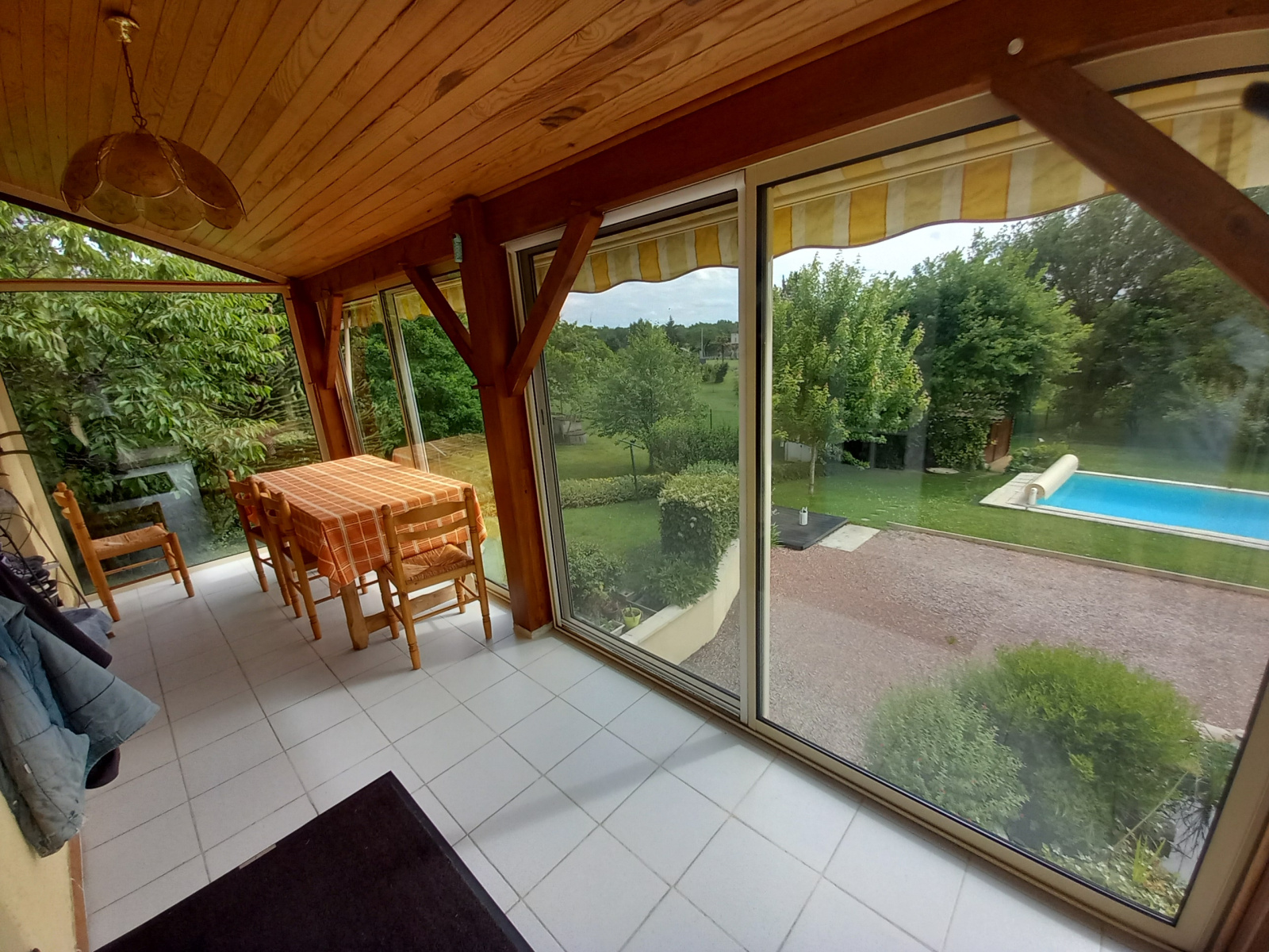Un spacieux salon-séjour de 43 m², lumineux, avec accès direct à une véranda offrant une vue imprenable sur le parc et la piscine
